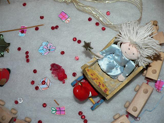 Természet sarok, a mi kis konyhánkban. Először évszakonként kapott új öltözetet ez a kis lomtalanított asztalka a sarokban. Aztán havonta, most pedig, hogy a téli ünnepek egymást követik, hetente átöltöztetjük. Ez most a téli tájkép hótündérrel és jeges golyókkal.