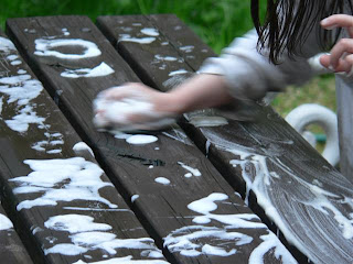 1) Hogy megkezdődött a házunk udvarában a nagytakarítás. És hogy ebben derekasan kivettük a részünket. Vödrök, szivacsok, gumicsizsma és slag . . . és sok gyerek . . . ragyognak a kerti bútorok.