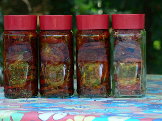 Nem tudom, említettem-e már, hogy gyakran befőzünk ezt-azt. Nekem úgy tűnik, hogy gyakrabban, mint egy átlagos család, de lehet, hogy ezt csak a nyár vége mondatja velem, és a spájz, ahova már ember sem fér be, nemhogy még egy befőttesüveg. Most épp az aszalt paradicsom a soros, és egyben igzalmas, mert ilyet még sosem csináltuk. Hosszan tartott az aszalás, több nap kitartó munkája, pedig egy csúcsszuper aszalógép is a kezünk alá dolgozott. Maga az eltevés nem volt bonyolult, annyit súgnak az olasz internetes oldalak (és végre használom olasz nyelvtudásom) hogy 1 napot kell várni, mielőtt lezárjuk az üvegeket, mert az olaj szép lassan leülepszik, és utána kell tölteni, különben a felső sor megpenészedik. Hát azt meg ki szeretné? Úgyhogy még izgulhatunk pár hónapig.