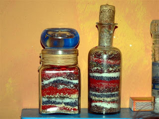 Ki nem emlékszik erre a dizájnra a kilencvenes évekből, amikor idétlen színű fürdősókból alkották a csíkos üvegeket? Ez jutott eszébe életem párjának, amikor a gyerekek már tonnaszámra darálták a terméseket. Így hát ma este volt program, kiraktuk, nagy munka volt, a következő hozzávalókkal: mák, cukor, só, kakaó, darált keksz, lenmag, darált tészta és darált borókabogyó. A dolog türelmet tanít, minden résztvevőnek :)